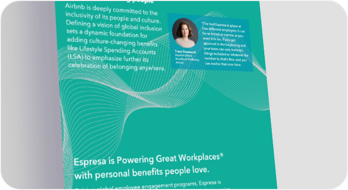 Globally supporting people Airbnb is deeply committed to the “I've had Espresa in place at inclusivity of its people and culture. four different employers. It can Defining a vision of global inclusion be as broad or narrow as you want it to be. If you get sets a dynamic foundation for approval in the beginning and adding culture-changing benefits your team can only have ten Tracy Desmond things included or whatever the like Lifestyle Spending Accounts Head of Global number is, that's fine, and you Benefits & Wellbeing (LSA) to emphasize further its can evolve that over time. Airbnb celebration of belonging anywhere. Espresa is Powering Great Workplaces® with personal benefits people love. Driving global employee engagement programs, Espresa is inclusively available in all languages, time zones, and currencies. And, with Espresa LSA Plus™, companies can power flexibility and freedom of choice with integrated total well-being, recognition, and community in a single app. espresa.com