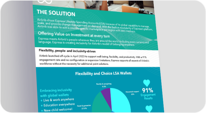 THE SOLUTION Airbnb chose Espresa Lifestyle Spending Accounts (LSA) because of its global capability to manage, scale, and provide change management on demand. With the built-in modularity of Espresa’s platform, Airbnb was able to add a country-specific marketplace per region with zero markups. Offering Value on Investment at every turn Espresa meets Airbnb’s people wherever they are around the world. Including every currency and language, Espresa is creating inclusivity for Airbnb’s model of belonging anywhere. Flexibility, people- and inclusivity-driven Airbnb launched off-cycle in April 2023 to support well-being, flexibility, and productivity. With a 91% engagement rate and no configuration or expansion limitations, Espresa supports all aspects of Airbnb’s workforce without the necessity for additional point solutions. Flexibility and Choice LSA Wallets Family & caregiving 8.2% Embracing inclusivity Household support 91% with global wallets 32% Engagement + Live & work anywhere Results + Education everywhere Food & groceries 27.8% + New child welcome! 6,940+ eligible employees in 23+ 93% countries Member Satisfaction Score Fitness & well-being 32% Airbnb Case Study | Flexibility and Choice, Belonging Everywhere espresa.com