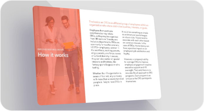The basics: an ERG is an afifliated group of employees within an organization who share distinctive qualities, interests, or goals. Employees from particular It could be something as simple constituencies may initiate as an intramural sports league ERGs, or they may be organized or a book club. People tend to from HR teams or Diversity and associate with each other based Inclusion departments. ERGs are on common interests. In the commonly formed for veterans, case of ERGs, this tendency can LGBTQ+ employees, women in have a positive impact on an EMPLOYEE RESOURCE GROUPS the workforce, working parents, employee’s job satisfaction and single parents, and for purposes loyalty. How it works of cultural diversity. However, they can also center on special However, a company’s ability interests and hobbies, like to leverage ERGs to improve fantasy sports leagues or wine employee engagement requires tasting. executive support and HR oversight. That said, there is no Whether the HR organization is one-size-ifts-all approach to ERG aware of it or not, any company programs. Each program is as with more than a couple hundred unique as the ERG participants people is likely to have ERGs in themselves. place.