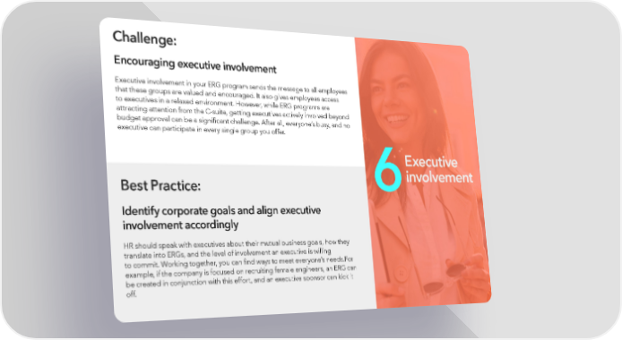 Challenge: Encouraging executive involvement Executive involvement in your ERG program sends the message to all employees that these groups are valued and encouraged. It also gives employees access to executives in a relaxed environment. However, while ERG programs are attracting attention from the C-suite, getting executives actively involved beyond budget approval can be a signiifcant challenge. After all, everyone’s busy, and no executive can participate in every single group you offer. Executive involvement Best Practice: 6 Identify corporate goals and align executive involvement accordingly HR should speak with executives about their mutual business goals, how they translate into ERGs, and the level of involvement an executive is willing to commit. Working together, you can find ways to meet everyone’s needs.For example, if the company is focused on recruiting female engineers, an ERG can be created in conjunction with this effort, and an executive sponsor can kick it off.