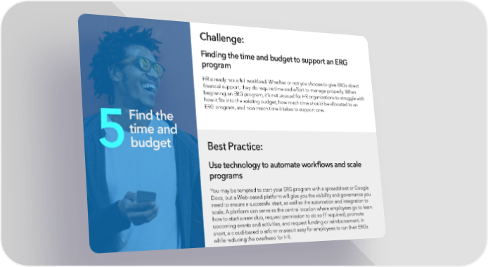 Challenge: Finding the time and budget to support an ERG program HR already has a full workload. Whether or not you choose to give ERGs direct ifnancial support, they do require time and effort to manage properly. When beginning an ERG program, it’s not unusual for HR organizations to struggle with how it ifts into the existing budget, how much time should be allocated to an Find the ERG program, and how much time it takes to support one. time and 5budget Best Practice: Use technology to automate workflows and scale programs You may be tempted to start your ERG program with a spreadsheet or Google Docs, but a Web-based platform will give you the visibility and governance you need to ensure a successful start, as well as the automation and integration to scale. A platform can serve as the central location where employees go to learn how to start a new club, request permission to do so (if required), promote upcoming events and activities, and request funding or reimbursement. In short, a cloud-based platform makes it easy for employees to run their ERGs while reducing the overhead for HR.