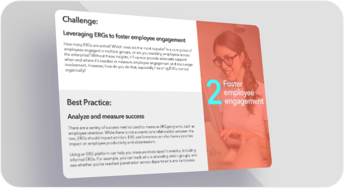 Challenge: Leveraging ERGs to foster employee engagement How many ERGs are active? Which ones are the most popular? Is a core group of employees engaged in multiple groups, or are you reaching employees across the enterprise? Without these insights, HR cannot provide adequate support when and where it’s needed or measure employee engagement and encourage involvement. However, how do you do that, especially if existing ERGs started organically? Foster employee engagement Best Practice: 2 Analyze and measure success There are a variety of success metrics used to measure ERG programs, such as employee retention. While there is not a one-to-one relationship between the two, ERGs should impact attrition. ERG performance can also have a positive impact on employee productivity and absenteeism. Using an ERG platform can help you measure more specific metrics, including informal ERGs. For example, you can track who is attending which groups, and see whether you’ve reached penetration across departments and campuses.