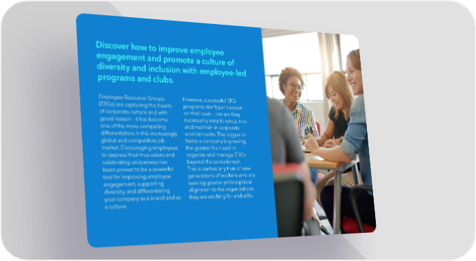 Discover how to improve employee engagement and promote a culture of diversity and inclusion with employee-led programs and clubs. Employee Resource Groups However, successful ERG (ERGs) are capturing the hearts programs don’t just happen of corporate culture and with on their own – nor are they good reason – it has become necessarily easy to setup, run, one of the more compelling and maintain in corporate differentiators in this increasingly environments. The bigger or global and competitive job faster a company is growing, market. Encouraging employees the greater the need to to express their true selves and organize and manage ERGs celebrating uniqueness has beyond the spreadsheet. been proven to be a powerful This is particularly true of new tool for improving employee generations of workers who are engagement, supporting seeking greater philosophical diversity, and differentiating alignment to the organizations your company as a brand and as they are working for and with. a culture.