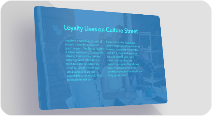 Loyalty Lives on Culture Street Loyalty is a hard thing to ask of If you want to be that place people these days, and with where employees love to come good reason. The fact is, loyalty to work, love their workmates, is a two-way street. Companies and are a vocal ambassador looking to attract and retain for your brand, you need amazing talent into full-time a solid recognition and roles need to be extremely rewards program that shows creative. Good people that your employees that their are a cultural 昀椀t are not contributions as individuals are expendable, nor should they truly appreciated. be made to feel so.