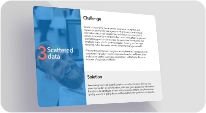 Challenge Beside improving the overall people experience, recognition and rewards programs offer managers and HR and people teams crucial information about their people’s likes and dislikes. For example, if a person is consistently rewarded for hard work, being a team player, and exemplifying your company values, it is easy to see that retaining that employee is a priority for your organization. Knowing who has been rewarded makes the review process simpler for managers as well! Scattered If recognition and rewards programs are implemented haphazardly, with data stored manually in scattered documents and spreadsheets, those data analytics are useless to you as a people team, and to leadership as an 3 indicator of organizational health. Solution Keep recognition and rewards data in a centralized location. This not only eases the burden on administration, but it also gives managers a transparent foundation for employee reviews and promotions. HR and people teams can quickly see who is going above and beyond for the organization consistently.