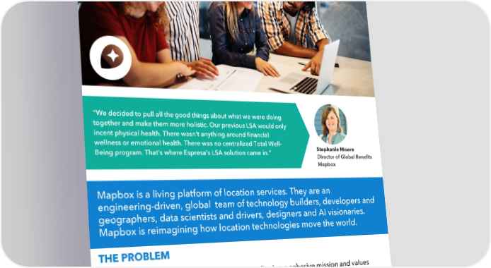 “We decided to pull all the good things about what we were doing together and make them more holistic. Our previous LSA would only incent physical health. There wasn’t anything around financial wellness or emotional health. There was no centralized Total Well- Stephanie Moore Being program. That’s where Espresa’s LSA solution came in.” Director of Global Benefits Mapbox Mapbox is a living platform of location services. They are an engineering-driven, global team of technology builders, developers and geographers, data scientists and drivers, designers and AI visionaries. Mapbox is reimagining how location technologies move the world. THE PROBLEM Mapbox adopted a benefits strategy aimed at aligning a cohesive mission and values tailored to the diverse needs of its global and distributed workforce. However, the HR and People Operations teams faced challenges due to global budget constraints and varying country-specific requirements, leading to a lack of uniformity and equity in benefits. The intricate nature of global benefits management added complexity for both HR and finance, hindering Mapbox‘s pursuit of a people-first culture. Mapbox Case Study | Navigating Challenges to Pioneer the Future of HR espresa.com