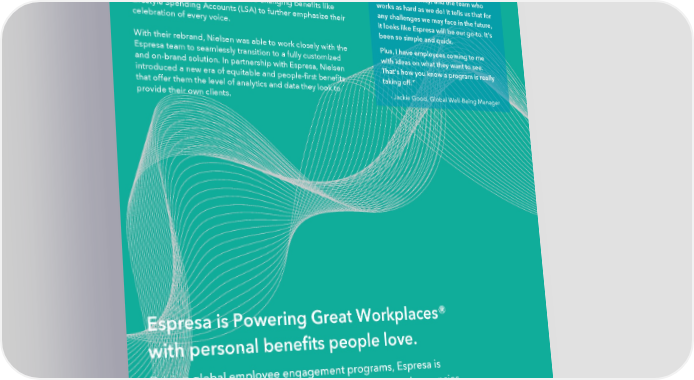 Globally supporting people “We’re very grateful for the product, the Nielsen is deeply committed to its people and culture. By product’s flexibility, and the team who starting with diversity, equity, and inclusion, they set a works as hard as we do! It tells us that for dynamic foundation to add culture-changing benefits like any challenges we may face in the future, Lifestyle Spending Accounts (LSA) to further emphasize their it looks like Espresa will be our go-to. It’s celebration of every voice. been so simple and quick. Plus, I have employees coming to me With their rebrand, Nielsen was able to work closely with the with ideas on what they want to see. Espresa team to seamlessly transition to a fully customized That’s how you know a program is really and on-brand solution. In partnership with Espresa, Nielsen taking off.” introduced a new era of equitable and people-first benefits that offer them the level of analytics and data they look to - Jackie Good, Global Well-Being Manager provide their own clients. Espresa is Powering Great Workplaces® with personal benefits people love. Driving global employee engagement programs, Espresa is inclusively available in all languages, time zones, and currencies. And, with Espresa LSA Plus™, companies can power flexibility and freedom of choice with integrated total well-being, recognition, and community in a single app. espresa.com