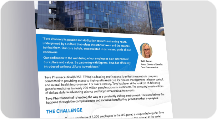 “Teva channels its passion and dedication towards enhancing health, underpinned by a culture that values the actions taken and the reasons behind them. Our core beliefs, encapsulated in our values, guide all our endeavors. Our dedication to the well-being of our employees is an extension of Beth Barrett our culture and values. By partnering with Espresa, Teva has efficiently Assoc. Director of Benefits introduced wellness LSAs to its workforce.” Teva Pharmaceutical Teva Pharmaceutical (NYSE: TEVA) is a leading multinational Israeli pharmaceuticals company, committed to providing access to high-quality medicine for disease management, infection control, and overall health improvement. For over a century, Teva has been at the forefront of delivering generic medicines to nearly 200 million people across six continents. The company invests millions of dollars daily in advancing science and biopharmaceutical treatments. Teva Pharmaceutical is leading the way in a constantly shifting environment. They also believe this happens through the compassionate and inclusive benefits they provide to their employees. THE CHALLENGE Managing a diverse workforce of 5,200 employees in the U.S. posed a unique challenge for Teva Pharmaceutical. They needed to develop a cohesive reimbursement that catered to the varied needs of their global employees while minimizing administrative strain on HR and finance teams. The solution required flexibility, user-friendliness, global relevance, and a mobile-first approach capable of handling adjudication in multiple languages and currencies. Teva Pharmaceutical aimed to find a comprehensive and scalable solution to efficiently manage operations across all countries and continents while providing a straightforward and modern platform to enhance employee engagement and experiences. Teva Pharmaceutical Case Study | Fostering Personal Benefits Worldwide with LSAs espresa.com